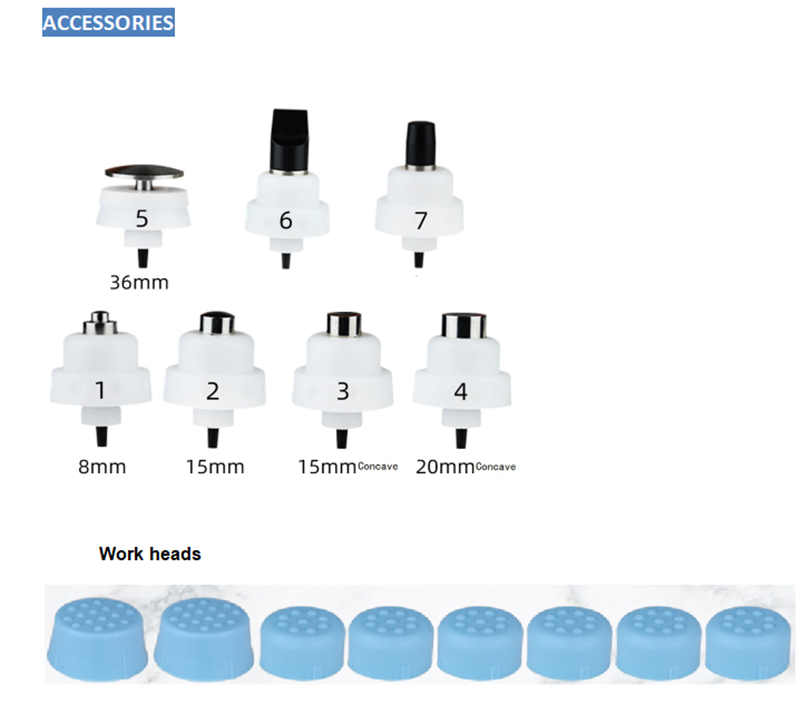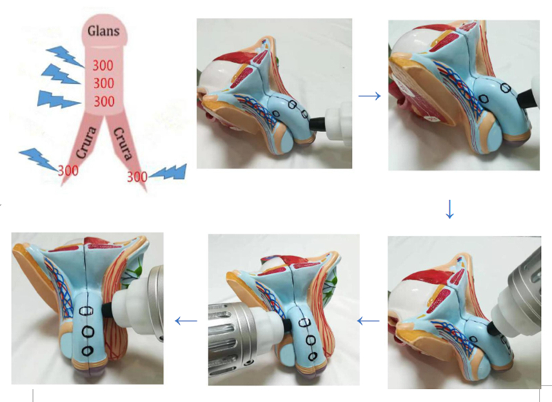 Choose the 6# and 7# exclusive ED treatment work head, Along the 5 areas of the spongy tissue, 300 impacts per area, total 1500 impacts in one round, about 20 minutes.