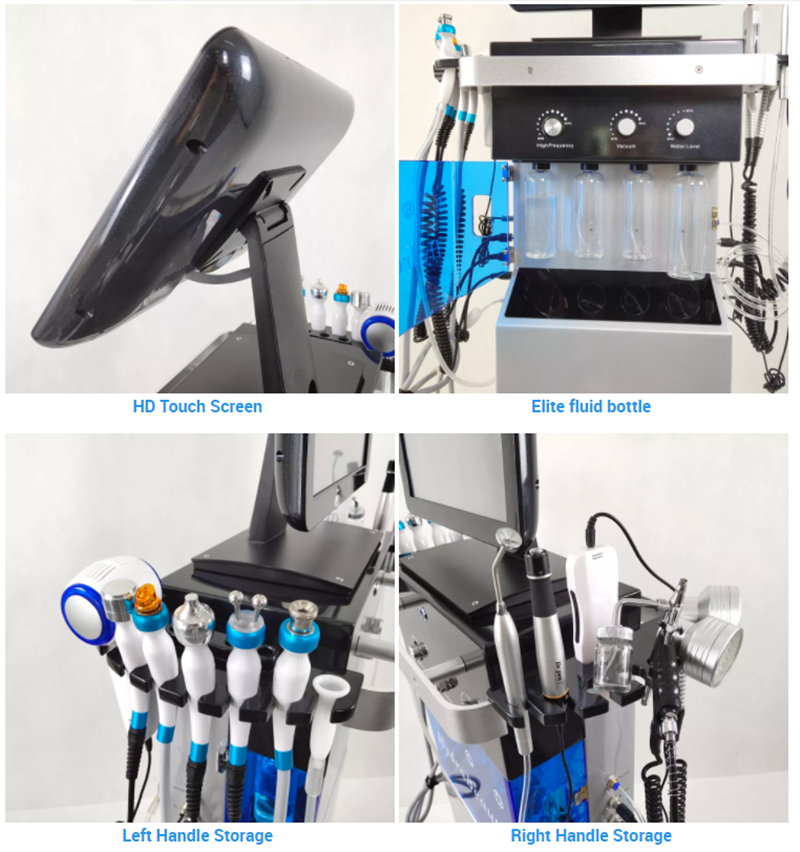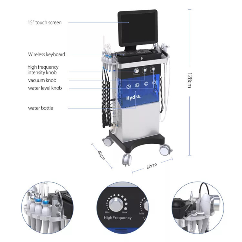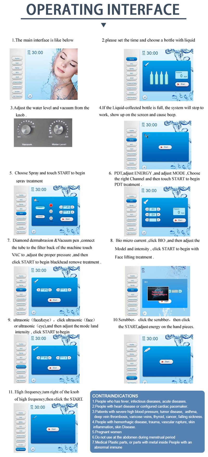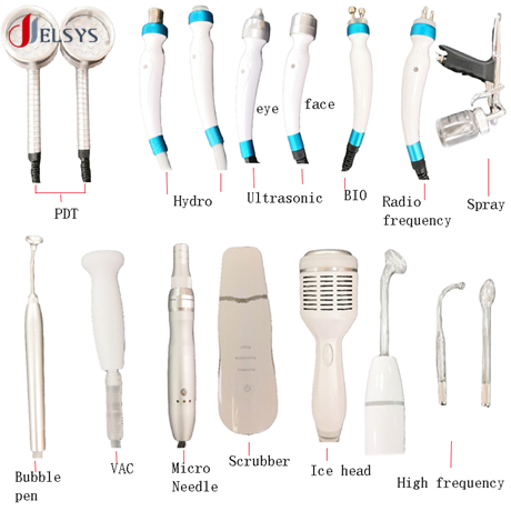 dermabrasion with 8 tips Bio microcurrent 1 piece Vacuum pen 3 different sizes Photon light with 2 handles Spray mist gun 1 piece High frequency 1 piece Ultrasonic 2 piece Dermabransion 1 pcs Skin scrubber 1 pcs |